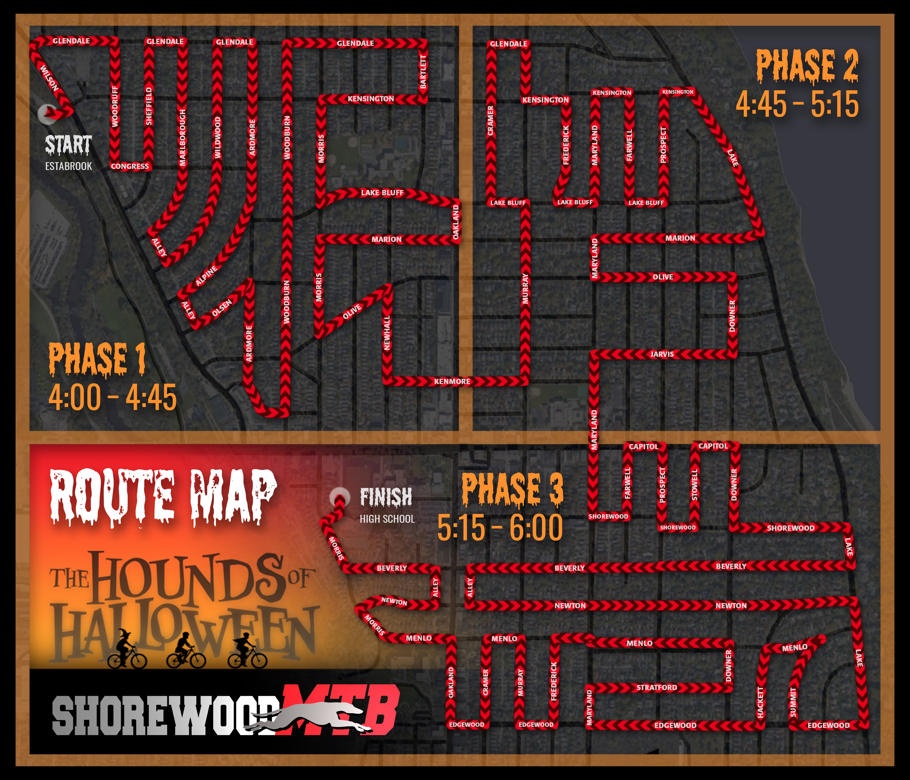 The Hounds of Halloween will be parading around Shorewood on Halloween, Saturday (October 31st) between 4:00 and 6:00 PM. Check out the route map to know when to expect these rolling ghosts and ghouls on your street. We'll have Covid-safe treats for our youngest Shorewood MTB fans and costumes you won't want to miss.